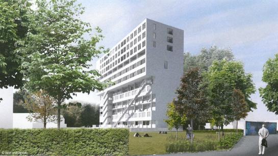 “De nieuwe Albertbuilding krijgt 12 verdiepingen en maar liefst 78 appartementen – zes meer dan vandaag,” zegt onze voorzitter Hannes De Geest. “We voorzien verschillende woningtypes, van studio’s tot appartementen met 1 tot 5 slaapkamers. Zo realiseren we extra betaalbare en energiezuinige woningen en behouden we de rol van het gebouw als herkenbaar baken in de skyline van Kessel-Lo.”
